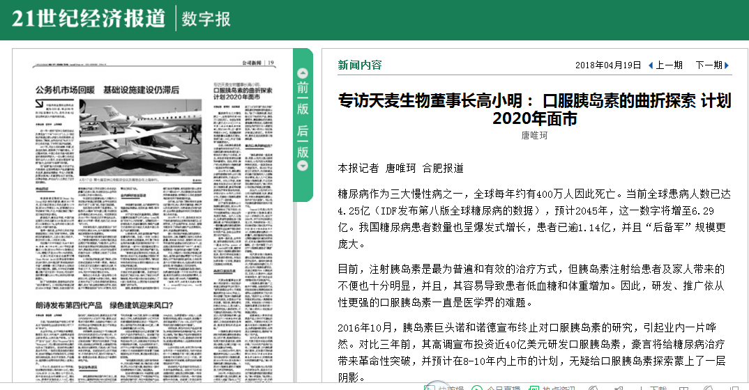 272018-06 天麦生物亮相第十八届世界制药原料展,让“中国制药”大放异彩! 2018年6月20-22日,第十八届世界制药原料中国展(下称CPhI China 2018)在上海新国际博览中心圆满落幕!本次展会掀起了一股强劲的医药新风,用海纳百川的气魄,缔造了一场国际化、高质量的年度医药行业盛宴!本次展会阵容空前壮大,为期3天的展会迎来120多个国家和地区的6万余名专业买家到会,较去年有大幅增长,不仅佐证了CPhI China的实力提升,更展现了中国医药市场蓬勃向上的发展势头 查看详情 》 212018-05 企业不欠“环境债”,以身作则树标杆 今年是改革开放40周年,伟大的改革开放让中国“走进了新时代”,成为了全球经济增长的“强劲引擎”。在这几十年里,中国经济社会发展取得历史性成就,但也面临了资源环境方面的诸多问题。近年来,由于环境异变导致的各类疾病也频频发生,不断影响着中国人民对健康生活的追求。今天,中国人民对清新空气、清澈水质、清洁环境、健康食品、安全药品等健康生活状态的需求越来越迫切,对“生态文明与经济开发“的平衡发展更加向往。2 查看详情 》 202018-05 “贝壳网”专访报道:十年耕耘,数亿投资,天麦生物有望突破口服胰岛素世界性难题 贝壳社,是国内领先的医健行业创新创业服务平台,作为产经类新媒体公众号,特别原创发布了关于对天麦生物的报道: 近年来全球糖尿病发病率逐年上升。一组数据触目惊心:据国际糖尿病联盟统计,2017年全球糖尿病患者约有4.25 亿人,预测到2040年,全球将会有6.42亿人患有糖尿病,届时中国糖尿病患者将达到1.51亿,平均每10人中就有1位是糖尿病.. 查看详情 》 162018-05 《今日头条》:天麦生物科技创新,挑战口服胰岛素,亿万糖患家庭的福音 “人民对美好生活的向往,就是我们的奋斗目标。”十八大以来,党中央把人民身体健康作为全面建成小康社会的重要内涵。个人的健康关系着整个家庭的幸福,一个家庭的幸福能促进社会的安定,从维护全民健康和实现国家长远发展出发,身体力行、率先垂范,正在铺设一条以人民为中心的“健康之路”。2015年10月,十八届五中全会首次提出推进健康中国建设,“健康中国”上升为国家.. 查看详情 》 192018-04 《21世纪经济报道》:专访天麦生物董事长高小明: 口服胰岛素的曲折探索 计划2020年面市 糖尿病作为三大慢性病之一,全球每年约有400万人因此死亡。当前全球患病人数已达4.25亿(IDF发布第八版全球糖尿病的数据),预计2045年,这一数字将增至6.29亿。我国糖尿病患者数量也呈爆发式增长,患者已逾1.14亿,并且“后备军”规模更庞大。 查看详情 》 152018-03 天麦生物承担的国家国际科技合作专项通过验收 2018年3月15日,由天麦生物承担实施的国家国际科技合作专项课题——“新型胰岛素类似物联合研发” (项目编号:2013DFA30720),顺利通过了国家科技部国际合作司验收审批。该项目是天麦生物取得的第一个国家级项目,于2017年12月15日以高分通过专家评审委员会结题验收。国家国际科技合作专项是中国政府于2001年在国家层面设立的,旨在通过统筹、整合中国产学研的科技力量广泛、深入地开展国际科技 查看详情 》 052017-09 南艳湖•大健康产业高峰论坛在合肥顺利召开 2017年9月5日上午,由合肥经济技术开发区管委会主办、合肥天汇孵化科技有限公司、完美体育开户、上海宜糖生物科技有限公司、上海交通大学医学院瑞金医院联合承办的“南艳湖•大健康产业高峰论坛”在合肥顺利召开。高峰论坛从多角度探讨了大健康产业发展对慢病管理的意义、以及蛋白质口服给药技术的发展和应用、慢病管理的最新模式。 此次论坛邀请了诺贝尔奖获得者以色列理工学院阿夫拉姆•赫什科(Avra 查看详情 》 022014-07 藏龙卧虎 专注七年人工胰岛素即将亮剑 来源:安徽商报.2014-07-02 引用网址:http://epaper.anhuinews.com/html/ahsb/20140702/article_3116810.shtml 曾有媒体描述完美体育开户(以下简称“天麦生物”),称“藏龙卧虎于经开区”。这家低调的企业落户经开区已经7年,一直在做胰岛素研究。他们采用国际先进的技术和欧盟标准,产品样品已经国家检验机构检验合格。在 查看详情 》 052012-12 坚持实干快干 推进项目建设 昨天下午,2012年市重大项目领导小组第三次调度会在市政务中心召开。会议总结了近一阶段全市重大项目推进情况,对我市2012年中央预算内投资计划执行情况以及合肥天麦生物科技公司胰岛素项目等4个项目进行具体调度。省委常委、市委书记、市重大项目领导小组组长吴存荣主持会议并讲话。他强调,要在党的十八大精神指引下,坚持实干快干,奋力推进项目建设,进一步用好管好中央投资,加快建设区域性特大城市,为建设美好安徽 查看详情 》 上一页 1 2 下一页