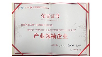 天麦生物被评为“2019中日先进医疗与新药研发高峰论坛”产业领袖企业。