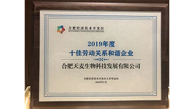 合肥经济技术开发区人事劳动局授予天麦生物“合肥经济技术开发区2019年度十佳劳动关系和谐企业”荣誉称号。