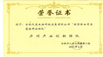 天麦生物“新型蛋白质类药物研发团队”被合肥市人才工作领导小组评定为“庐州产业创新团队”。